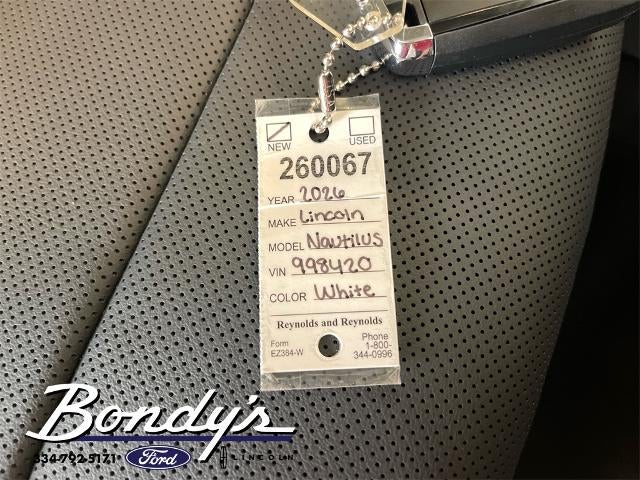 2026 Lincoln Nautilus Premiere 2.0L GTDI FHEV, 10 Speakers, 110V Power Converter, 19 Bright Machined Aluminum Wheels, 4-Wheel Disc Brakes, ABS brakes, Air Conditioning, Alloy wheels, AM/FM radio: SiriusXM with 360L, Apple CarPlay/Android Auto, Auto Air Refresh, Auto High-beam Headlights, Auto tilt-away steering wheel, Auto-dimming Rear-View mirror, Automatic temperature control, BlueCruise Equipped (4-Years Included), Brake assist, Bumpers: body-color, Compass, Delay-off headlights, Digital Scent, Driver door bin, Driver vanity mirror, Dual front impact airbags, Dual front side impact airbags, Electronic Stability Control, Emergency communication system: 911 Assist, Equipment Group 102A, Exterior Parking Camera Rear, Four wheel independent suspension, Front anti-roll bar, Front Bucket Seats, Front Center Armrest w/Storage, Front dual zone A/C, Front reading lights, Fully automatic headlights, Garage door transmitter, Hands-Free Power Liftgate, Heated door mirrors, Heated front seats, Heated steering wheel, Illuminated entry, Knee airbag, Leather steering wheel, Lincoln Connectivity Package, Lincoln Digital Experience, Lincoln Soft Touch Heated Front Captain's Chairs, Low tire pressure warning, Memory seat, Navigation System, Occupant sensing airbag, Outside temperature display, Overhead airbag, Overhead console, Panic alarm, Panoramic Vista Roof with Powershade, Passenger door bin, Passenger vanity mirror, Power door mirrors, Power driver seat, Power Liftgate, Power passenger seat, Power steering, Power windows, Radio data system, Radio: AM/FM Premium Audio, Radio: AM/FM Revel Audio System, Rain sensing wipers, Rear anti-roll bar, Rear Heated Seats with Switch Control, Rear reading lights, Rear seat center armrest, Rear window defroster, Rear window wiper, Remote keyless entry, Security system, SiriusXM with 360L, Speed control, Speed-sensing steering, Speed-Sensitive Wipers, Split folding rear seat, Spoiler, Steering wheel memory, Steering wheel mounted audio controls, Tachometer, Telescoping steering wheel, Tilt steering wheel, Traction control, Trip computer, Turn signal indicator mirrors, Variably intermittent wipers, Ventilated Front Seats, Wheels: 20 Bright Machined Aluminum, 2.0L GTDI FHEV.