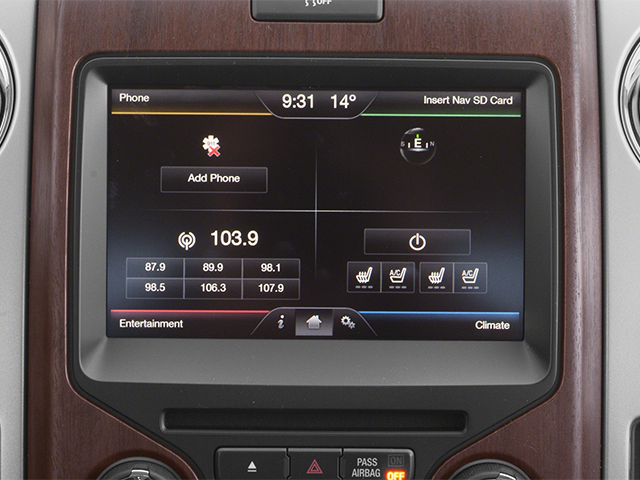 2014 Ford F-150 King Ranch 4WD, 10 Speakers, 18 7-Spoke Aluminum w/King Ranch Logo Wheels, 20 Chrome-Clad Aluminum Wheels, 4-Wheel Disc Brakes, 4x4 Off-Road Decal, 6 Chrome Angular Step Bars, ABS brakes, Adjustable pedals, Air Conditioning, All-Weather Rubber Floor Mats, Alloy wheels, AM/FM radio: SiriusXM, Auto tilt-away steering wheel, Auto-dimming door mirrors, Auto-dimming Rear-View mirror, Automatic temperature control, Body-Color Door Handles w/Chrome Strap, CD player, Chrome Grille Surround, Compass, Delay-off headlights, Driver door bin, Driver vanity mirror, Dual front impact airbags, Dual front side impact airbags, DVD-Audio, Electronic Stability Control, Equipment Group 600A, Exterior Parking Camera Rear, Front & Rear Off-Road Tuned Shock Absorbers, Front anti-roll bar, Front Bucket Seats, Front Center Armrest, Front Chrome Bumper, Front dual zone A/C, Front fog lights, Front reading lights, Front wheel independent suspension, Fully automatic headlights, Garage door transmitter, GVWR: 7,350 lbs Payload Package, Heated door mirrors, Heated front seats, Heated rear seats, High-Intensity Discharge Headlamps, Hill Descent Control, Illuminated entry, King Ranch Chaparral Leather Bucket Seats, King Ranch Chrome Package, King Ranch Luxury Package, King Ranch Monochromatic Paint Package, Leather steering wheel, Low tire pressure warning, Memory seat, Navigation, Occupant sensing airbag, Off-Road Package, Outside temperature display, Overhead airbag, Overhead console, Overhead Console w/Single Storage Bin, Painted A-Gloss Body-Color Wheel Lip Molding, Panic alarm, Passenger door bin, Passenger vanity mirror, Pedal memory, Power door mirrors, Power driver seat, Power Moonroof, Power passenger seat, Power steering, Power windows, PowerFold Heated Side Mirrors w/Chrome Skull Caps, Premium audio system: Sony, Radio data system, Radio: Sony Single-CD w/HD, Rear Parking Sensors, Rear reading lights, Rear seat center armrest, Rear step bumper, Rear window defroster, Remote keyless entry, Security system, SiriusXM Satellite Radio, Speed control, Speed-sensing steering, Split folding rear seat, Steering wheel memory, Steering wheel mounted audio controls, Styleside Chrome Rear w/Wrap-Over Step Pad, SYNC Voice Activated Communication & Entertainment, SYNC w/MyFord Touch & SYNC Services, Tachometer, Tailgate Step, Telescoping steering wheel, Tilt steering wheel, Traction control, Trailer Brake Controller, Trip computer, Turn signal indicator mirrors, Variably intermittent wipers, Ventilated front seats, 4WD. White Platinum Clearcoat Metallic 4WD