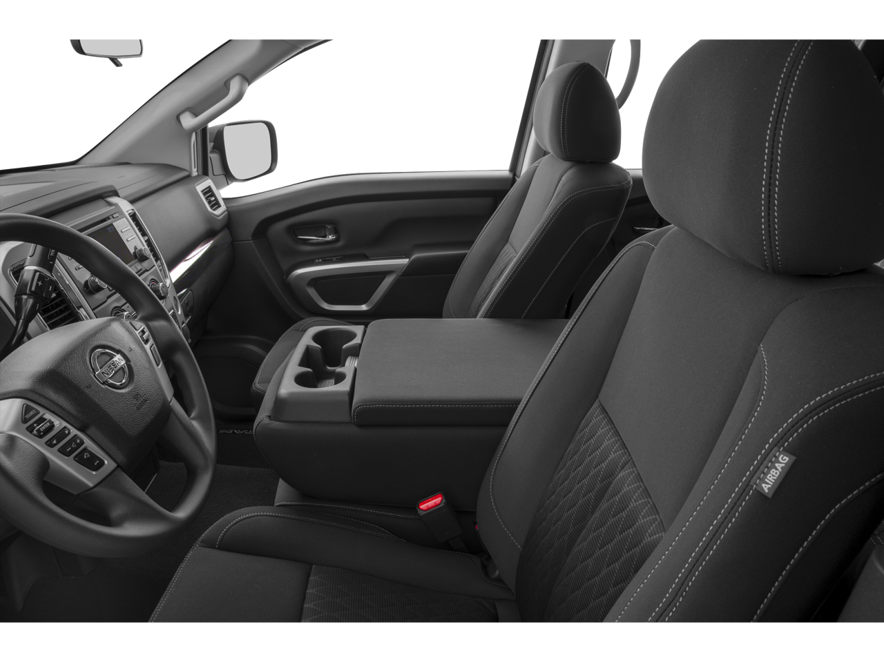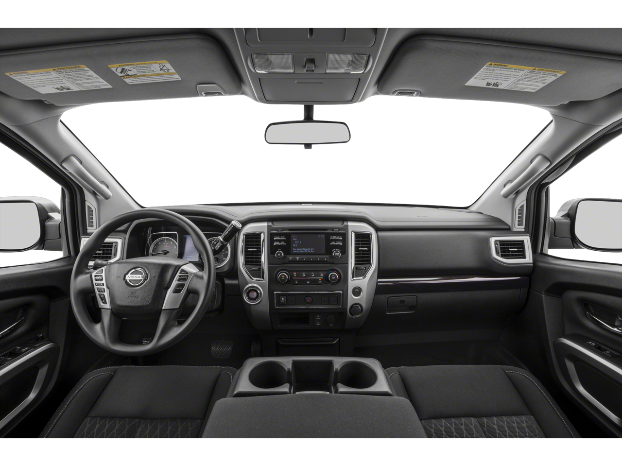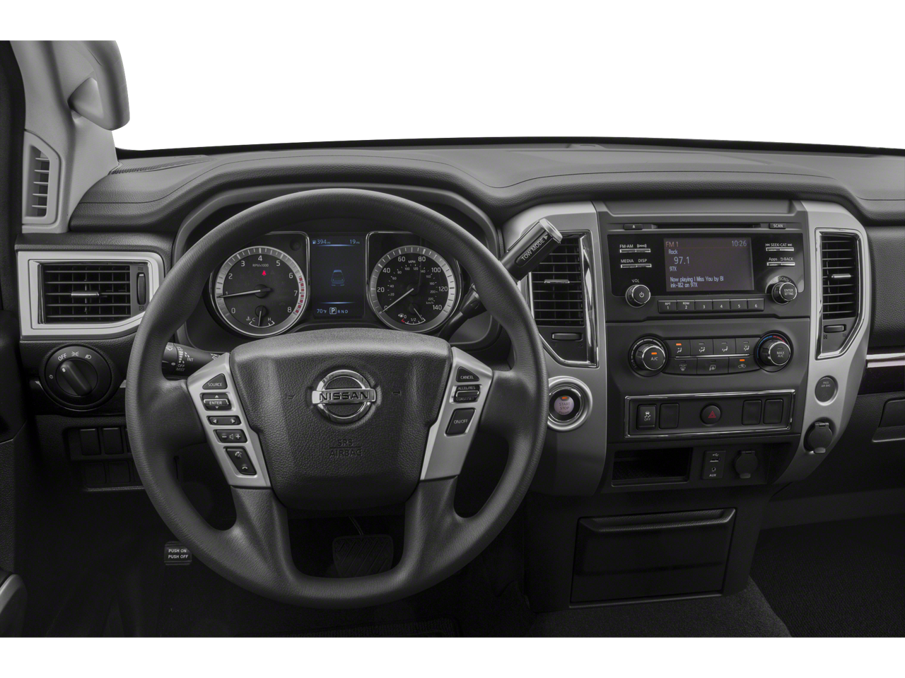 2019 Nissan Titan SV 2.937 Axle Ratio, 4-Wheel Disc Brakes, 6 Speakers, ABS brakes, Air Conditioning, Alloy wheels, AM/FM radio: SiriusXM, Brake assist, Bumpers: chrome, Carpeted Floor Mats, CD player, Cloth Seat Trim, Driver door bin, Driver vanity mirror, Dual front impact airbags, Dual front side impact airbags, Electronic Stability Control, Front anti-roll bar, Front Center Armrest w/Storage, Front Manual Split Bench Seat (40/20/40), Front reading lights, Front wheel independent suspension, Heated door mirrors, Heated Front Captain's Chairs, Illuminated entry, Leather Seat Trim, Low tire pressure warning, Nissan Navigation System, NissanConnect featuring Apple CarPlay and Android Auto, Occupant sensing airbag, Outside temperature display, Overhead airbag, Overhead console, Panic alarm, Passenger door bin, Passenger vanity mirror, Power door mirrors, Power steering, Power windows, Radio data system, Radio: NissanConnect AM/FM w/SiriusXM, Rear anti-roll bar, Rear seat center armrest, Rear step bumper, Rear window defroster, Remote keyless entry, Security system, Speed control, Speed-sensing steering, Speed-Sensitive Wipers, Split folding rear seat, Steering wheel mounted audio controls, Tachometer, Telescoping steering wheel, Tilt steering wheel, Traction control, Trip computer, Turn signal indicator mirrors, Variably intermittent wipers, Voltmeter, Wheels: 18 x 8 Silver Painted Alloy. Magnetic Black Metallic RWD