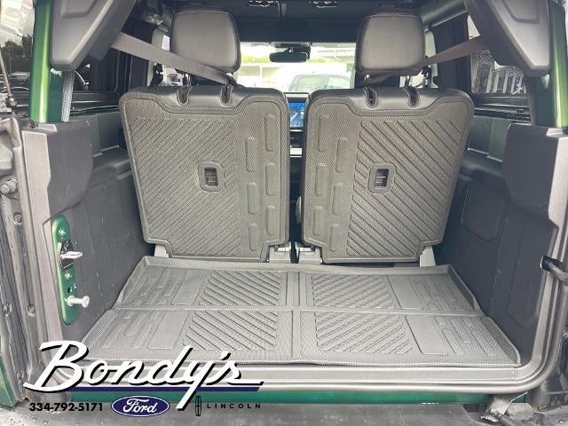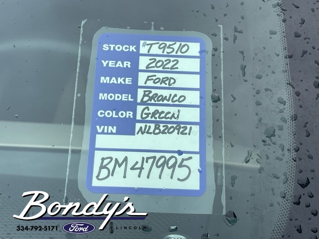 2022 Ford Bronco Wildtrak 4-Wheel Disc Brakes, 6 Speakers, ABS brakes, Air Conditioning, AM/FM radio: SiriusXM with 360L, AM/FM Stereo, Auto High-beam Headlights, Black Roof Rails w/Crossbars, Brake assist, Compass, Convertible HardTop, Convertible roof lining, Delay-off headlights, Driver door bin, Driver vanity mirror, Dual front impact airbags, Dual front side impact airbags, Electronic Stability Control, Emergency communication system: 911 Assist, Exterior Parking Camera Rear, Ford Performance Heavy-Duty Modular Front Bumper, Front anti-roll bar, Front Bucket Seats, Front Center Armrest, Front reading lights, Front wheel independent suspension, Fully automatic headlights, Glass rear window, Heated door mirrors, Illuminated entry, Integrated roll-over protection, Keyless Entry Keypad, Low tire pressure warning, Occupant sensing airbag, Outside temperature display, Overhead airbag, Overhead console, Panic alarm, Passenger door bin, Passenger vanity mirror, Power door mirrors, Power steering, Power windows, Radio data system, Rear window defroster, Rear window wiper, Remote keyless entry, Security system, SiriusXM Radio w/360L, Speed control, Split folding rear seat, Steering wheel mounted audio controls, SYNC 4, Tachometer, Telescoping steering wheel, Tilt steering wheel, Traction control, Trip computer, Variably intermittent wipers, Wheels: 17 Black High Gloss-Painted Aluminum. Eruption Green Metallic 4WD