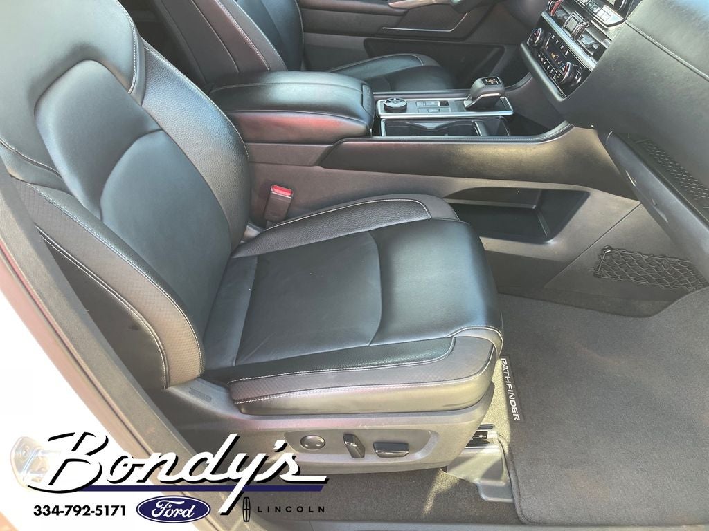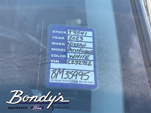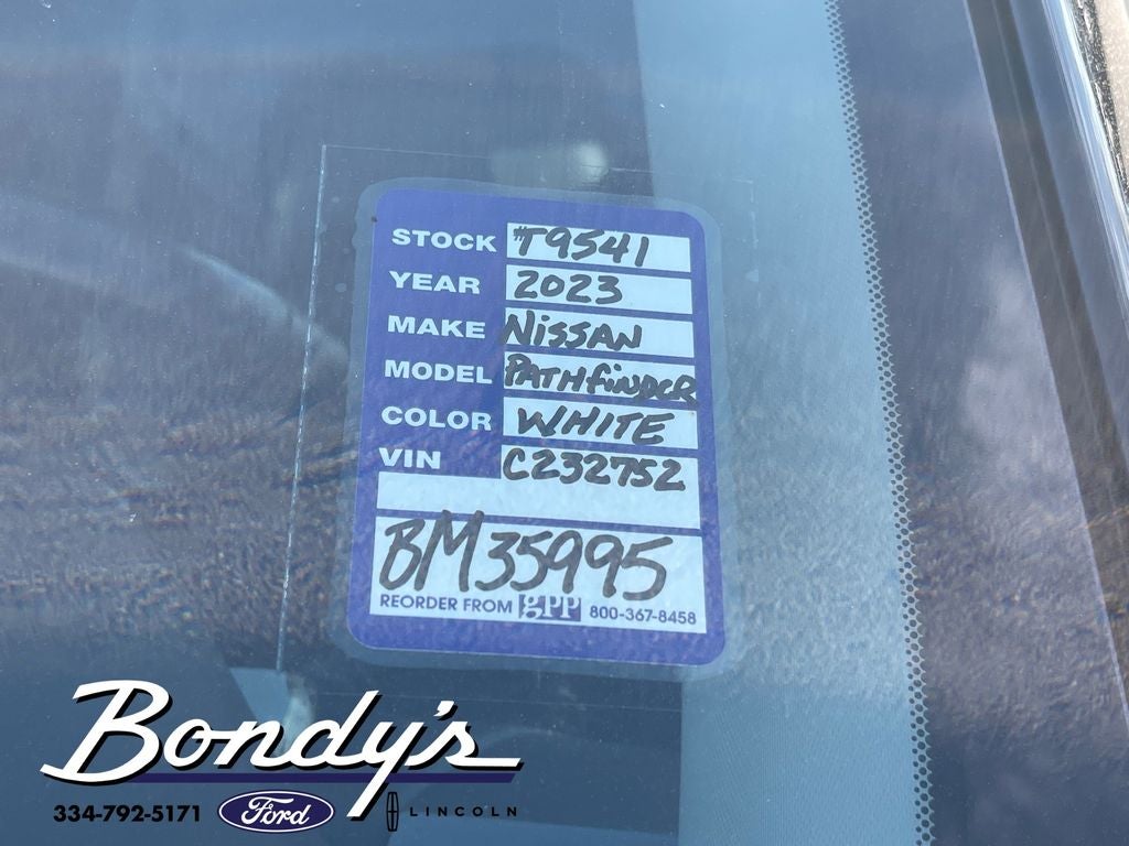 2023 Nissan Pathfinder SL 4WD, 18 Machined Alloy Wheels, 3rd row seats: bench, 4-Wheel Disc Brakes, 6 Speakers, ABS brakes, Air Conditioning, Alloy wheels, AM/FM radio: SiriusXM, Auto High-beam Headlights, Auto-dimming Rear-View mirror, Automatic temperature control, Axle Ratio: 4.334, Bench Seat Carpeted Floor Mats (Set of 4), Black Splash Guards (Set of 4), Brake assist, Bumpers: body-color, Cargo Area Protector, Cargo Net, Cargo Package, Cross Bars, Delay-off headlights, Driver door bin, Driver vanity mirror, Dual front impact airbags, Dual front side impact airbags, Electronic Stability Control, Emergency communication system: NissanConnect Services, Exterior Parking Camera Rear, First Aid Kit, Four wheel independent suspension, Front anti-roll bar, Front Bucket Seats, Front Center Armrest, Front dual zone A/C, Front reading lights, Fully automatic headlights, Garage door transmitter: HomeLink, Heated door mirrors, Heated Front Bucket Seats, Heated front seats, Heated steering wheel, Illuminated entry, Illuminated Kick Plate, Knee airbag, Leather Seating Surfaces, Leather steering wheel, LED Fog Lamps, Lighting Package (N92), Low tire pressure warning, Navigation system: NissanConnect Navigation, Nissan USB Charging Cable Set, NissanConnect w/Navigation & Services, Occupant sensing airbag, Outside temperature display, Overhead airbag, Overhead console, Panic alarm, Passenger door bin, Passenger vanity mirror, Power door mirrors, Power driver seat, Power Liftgate, Power passenger seat, Power steering, Power windows, Radio data system, Radio: AM/FM Audio System, Rear air conditioning, Rear anti-roll bar, Rear reading lights, Rear seat center armrest, Rear side impact airbag, Rear window defroster, Rear window wiper, Reclining 3rd row seat, Remote keyless entry, Security system, Speed control, Speed-sensing steering, Split folding rear seat, Spoiler, Steering wheel mounted audio controls, Tachometer, Telescoping steering wheel, Tilt steering wheel, Traction control, Trip computer, Turn signal indicator mirrors, Variably intermittent wipers, Welcome Lighting, 4WD. Pearl White Tricoat/Super Black 4WD