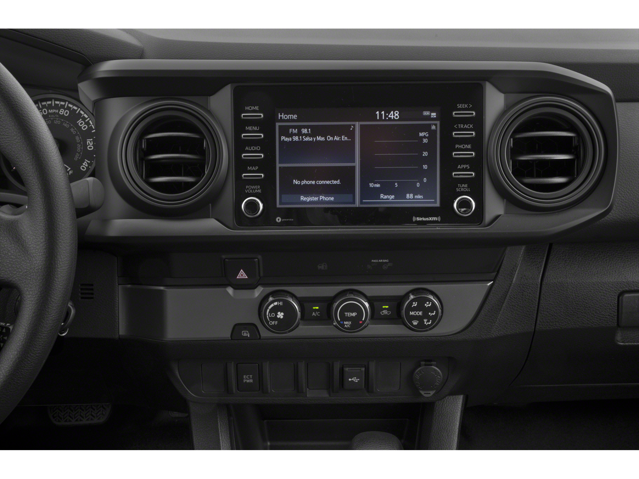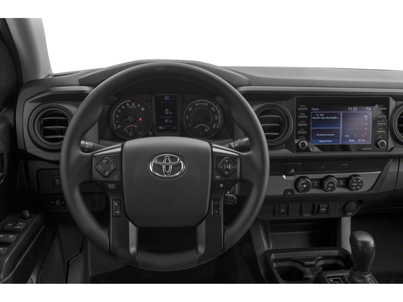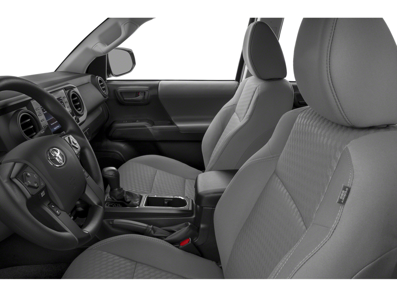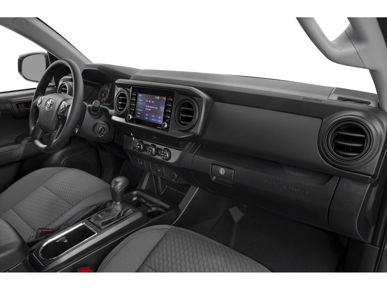 2023 Toyota Tacoma V6 4WD, 120V/400W Deck Mounted AC Power, ABS brakes, Air Conditioning, Alloy wheels, AM/FM radio: SiriusXM, Anti-whiplash front head restraints, Apple CarPlay/Android Auto, Auto High-beam Headlights, Auto-dimming Rear-View mirror, Auto-Dimming Rearview Mirror w/HomeLink, Automatic temperature control, Blind Spot Monitor w/Rear Cross Traffic Alert, Brake assist, Bumpers: body-color, Driver door bin, Dual front impact airbags, Dual front side impact airbags, Electronic Stability Control, Emergency communication system: Safety Connect (1-year trial), Engine Immobilizer, Exterior Parking Camera Rear, Front anti-roll bar, Front Bucket Seats, Front Center Armrest, Front dual zone A/C, Front fog lights, Front reading lights, Front wheel independent suspension, Garage door transmitter: HomeLink, Heated door mirrors, Illuminated entry, Knee airbag, Leather Shift Knob, Low tire pressure warning, Occupant sensing airbag, Outside temperature display, Overhead airbag, Overhead console, Panic alarm, Passenger door bin, Power door mirrors, Power driver seat, Power Sliding Rear Window w/Privacy Glass, Power steering, Power windows, Rear Parking Assist Sonar, Rear step bumper, Remote keyless entry, Security system, Speed control, Speed-sensing steering, Split folding rear seat, Steering wheel mounted audio controls, Tachometer, Telescoping steering wheel, Tilt steering wheel, Traction control, Trip computer, Turn signal indicator mirrors, Variably intermittent wipers, 4WD. V6 4WD