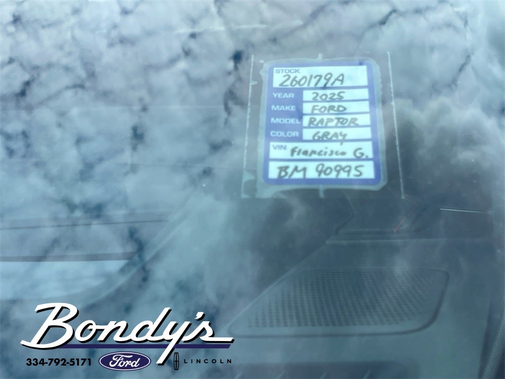 2025 Ford F-150 Raptor 4WD, 14 Speakers, 17 Cast Aluminum Wheels, 4-Wheel Disc Brakes, ABS brakes, Adjustable pedals, Air Conditioning, Alloy wheels, AM/FM radio: SiriusXM with 360L, Auto High-beam Headlights, Auto tilt-away steering wheel, Auto-dimming door mirrors, Auto-dimming Rear-View mirror, Automatic temperature control, Brake assist, Bumpers: body-color, Compass, Delay-off headlights, Driver door bin, Driver vanity mirror, Dual front impact airbags, Dual front side impact airbags, Electronic Locking w/4.10 Axle Ratio, Electronic Stability Control, Emergency communication system: SYNC 4 911 Assist, Equipment Group 801A Standard, Front anti-roll bar, Front Bucket Seats, Front Center Armrest, Front dual zone A/C, Front fog lights, Front License Plate Bracket, Front reading lights, Front wheel independent suspension, Fully automatic headlights, Garage door transmitter, Heads-Up Display, Heated door mirrors, Heated front seats, Heated rear seats, Heated steering wheel, Illuminated entry, Internet access capable: FordPass Connect 5G, Lane Departure Warning System, Leather steering wheel, Leather Trimmed Seats, Low tire pressure warning, Memory seat, Navigation system: Connected Navigation, Occupant sensing airbag, Outside temperature display, Overhead airbag, Overhead console, Panic alarm, Passenger door bin, Passenger vanity mirror, Pedal memory, Power door mirrors, Power driver seat, Power passenger seat, Power steering, Power windows, Radio data system, Radio: B&O Unleashed Sound System by Bang & Olufsen, Rain sensing wipers, Rear reading lights, Rear step bumper, Rear window defroster, Remote keyless entry, Security system, Speed control, Speed-sensing steering, Split folding rear seat, Steering wheel memory, Steering wheel mounted audio controls, SYNC 4 w/Enhanced Voice Recognition, Tachometer, Telescoping steering wheel, Tilt steering wheel, Tough Bed Spray-In Bedliner, Traction control, Trip computer, Turn signal indicator mirrors, Twin Panel Moonroof, Variably intermittent wipers, Ventilated front seats, 4WD. Gray Metallic 4WD